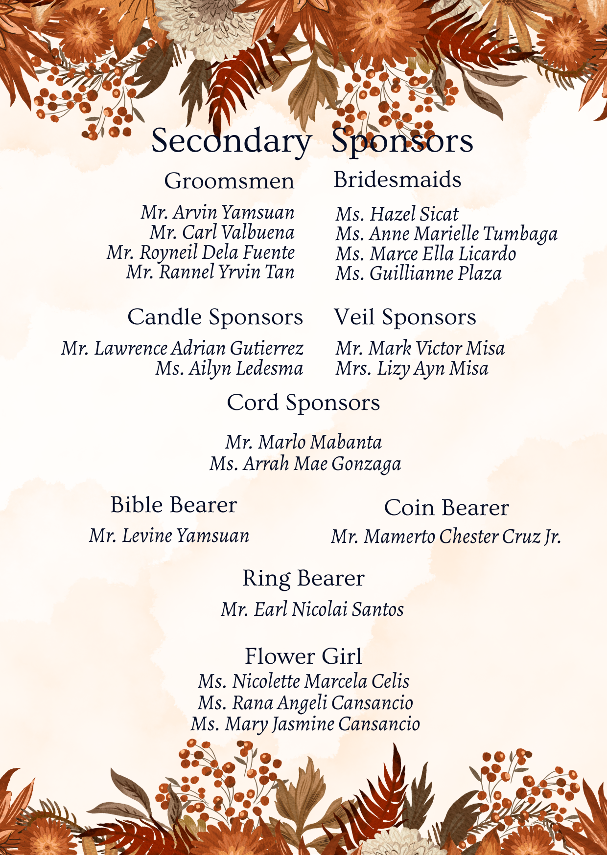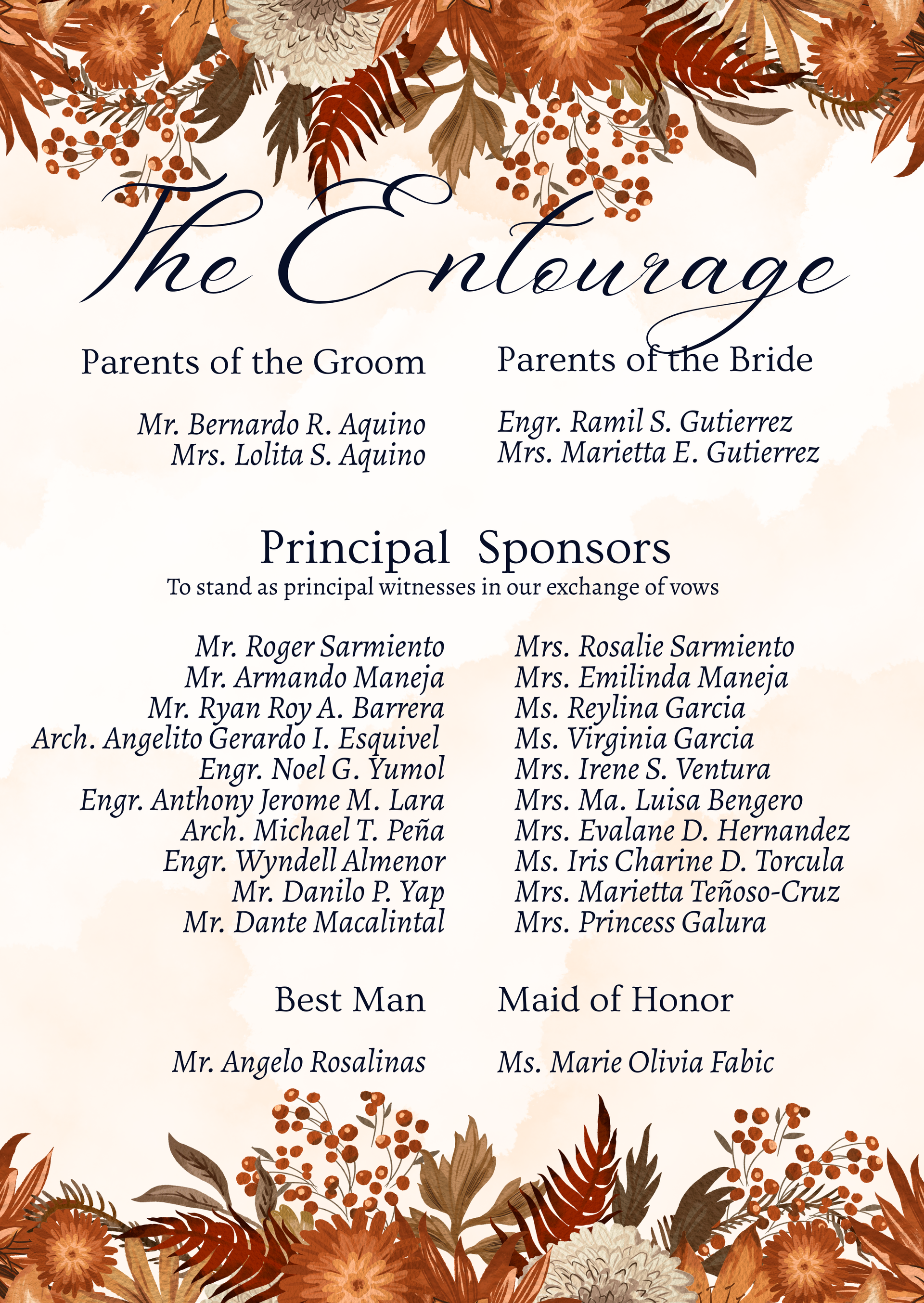 Please adhere to the specified dress code and color motif provided. Dressing accordingly is deeply appreciated, as it will contribute to the elegance and harmony of our celebration.