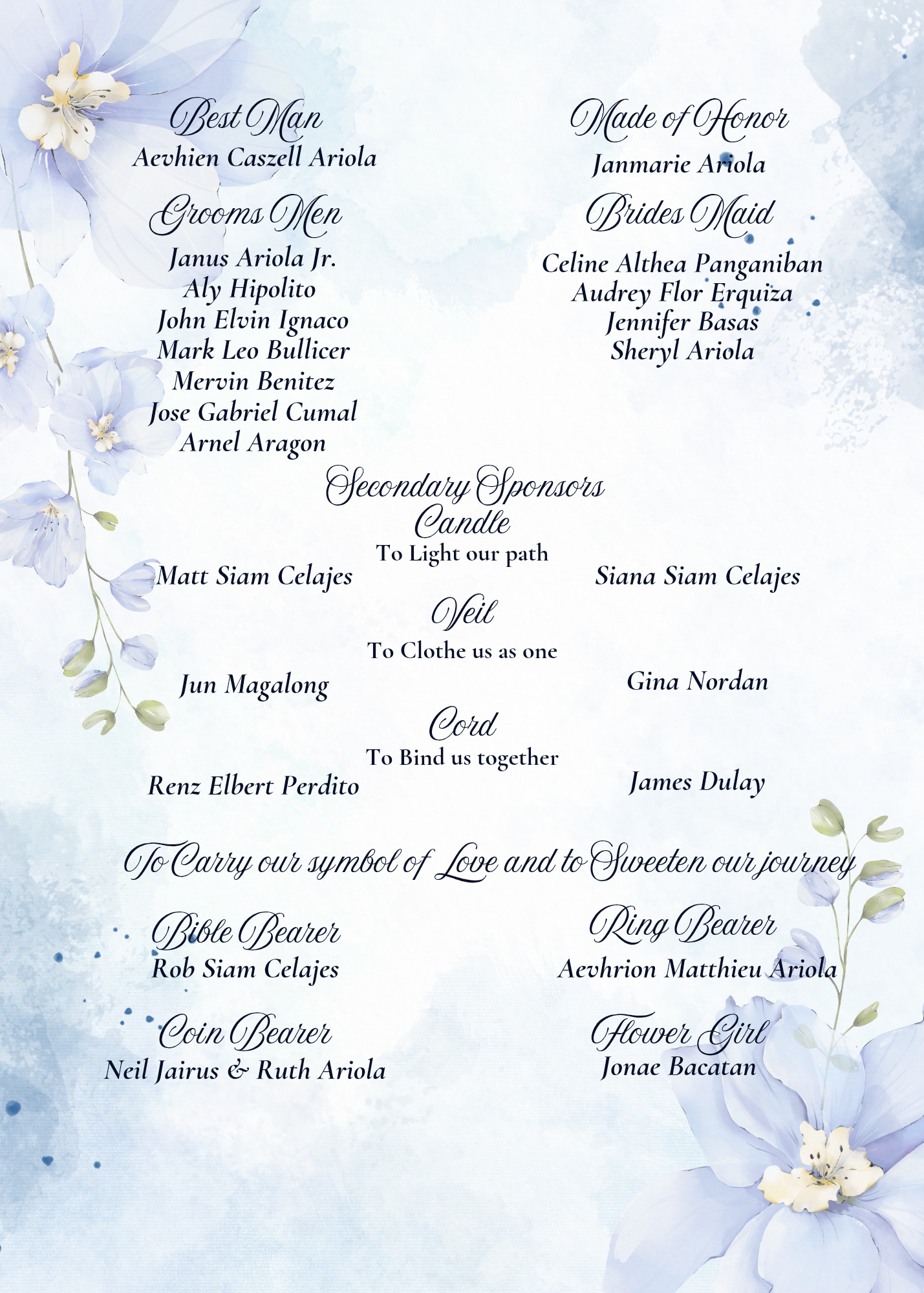 Please adhere to the specified dress code and color motif provided. Dressing accordingly is deeply appreciated, as it will contribute to the elegance and harmony of our celebration.