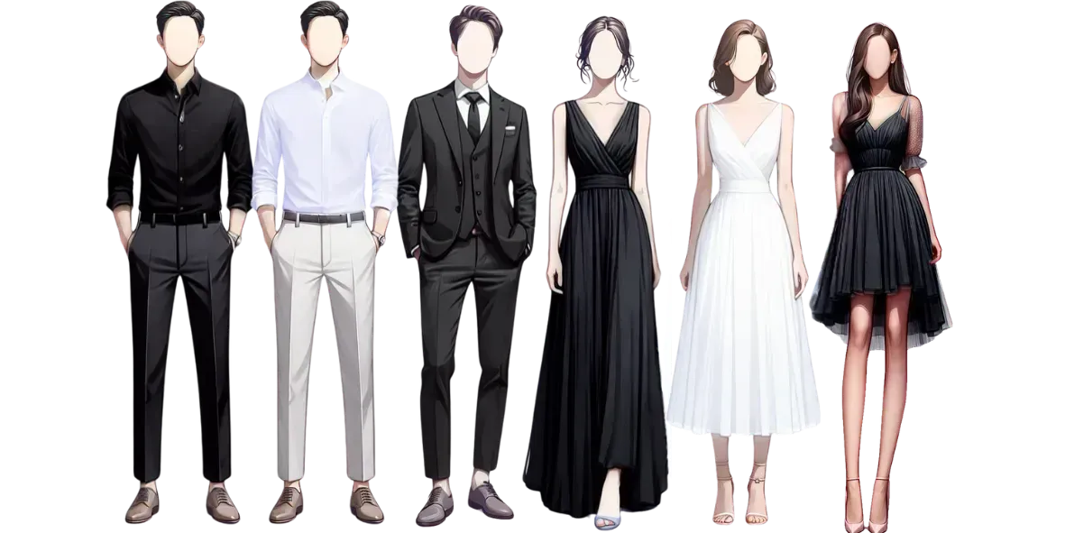 Male: Black Suit, Black or White Long or Short-Sleeved Polo and Slacks