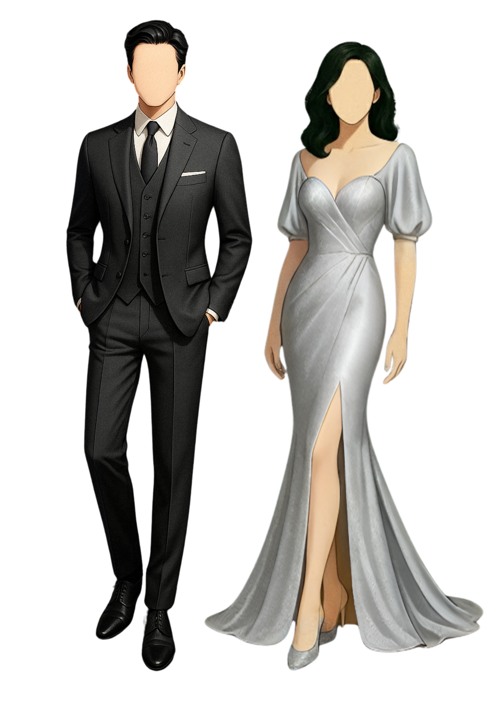 Gentlemen: Black or Grey suit, long sleeves, and black or gray tie