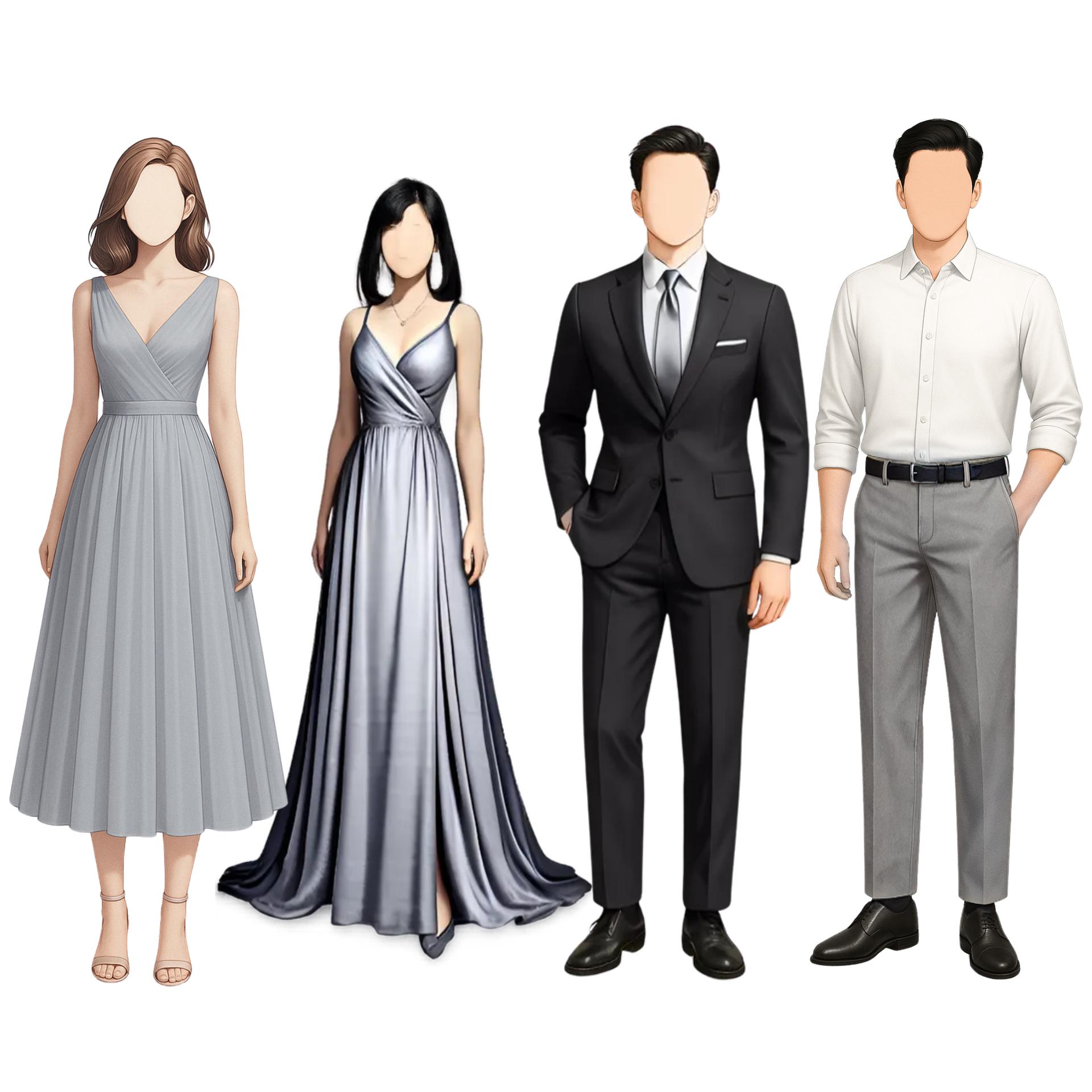 female: Long-floor length or below the knee dress