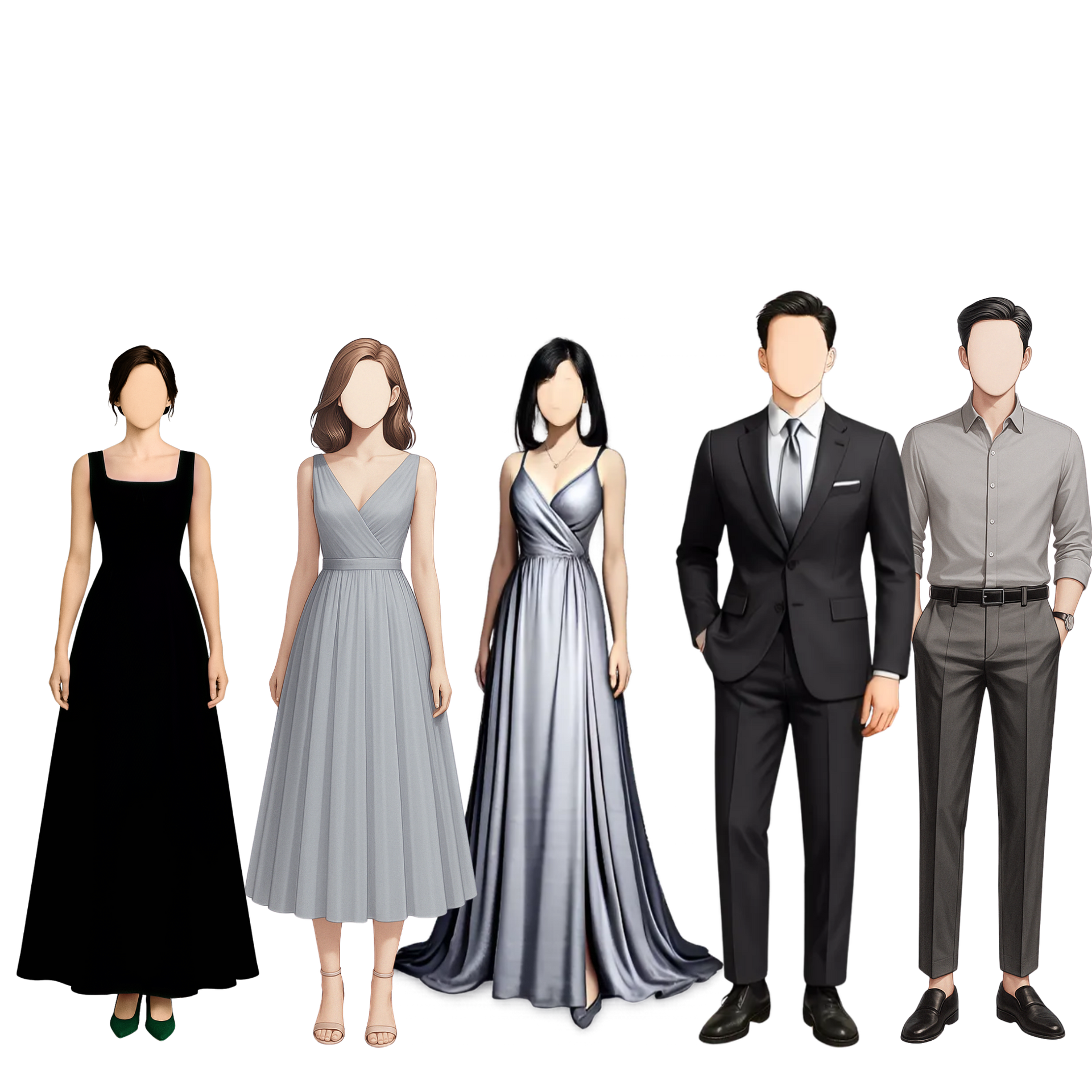 Ladies: black or grey dress below the knee length or grey floor length dress