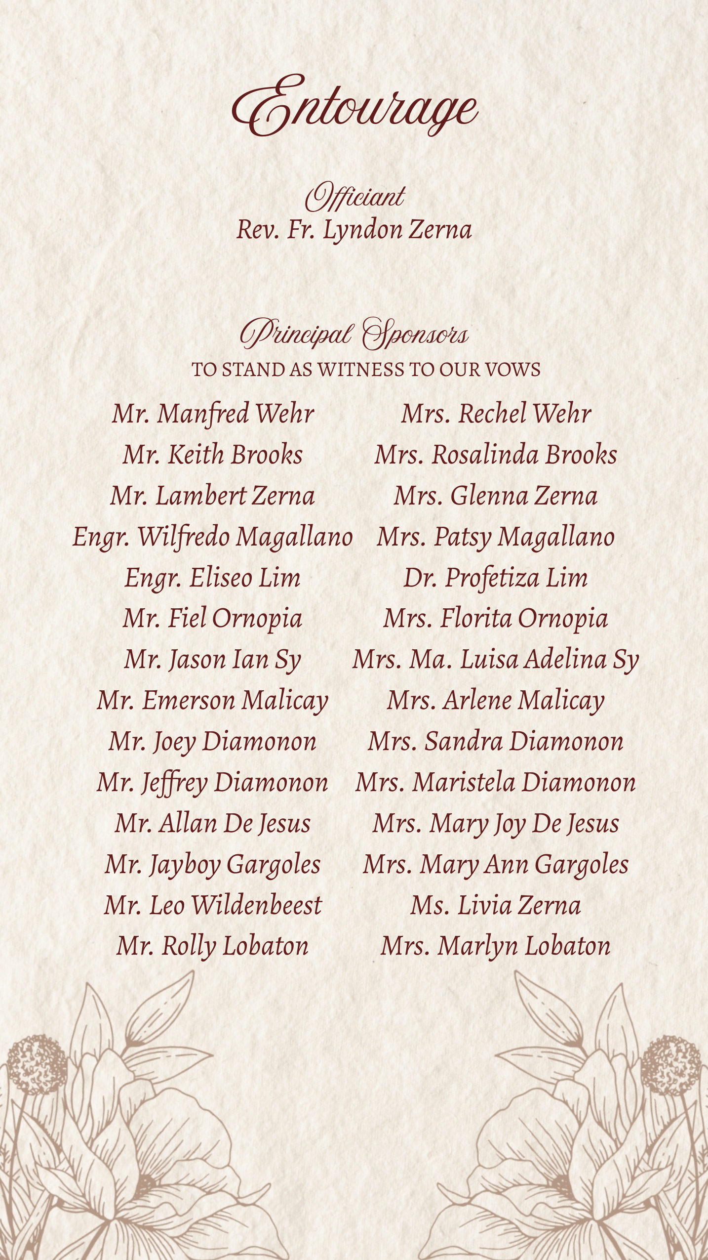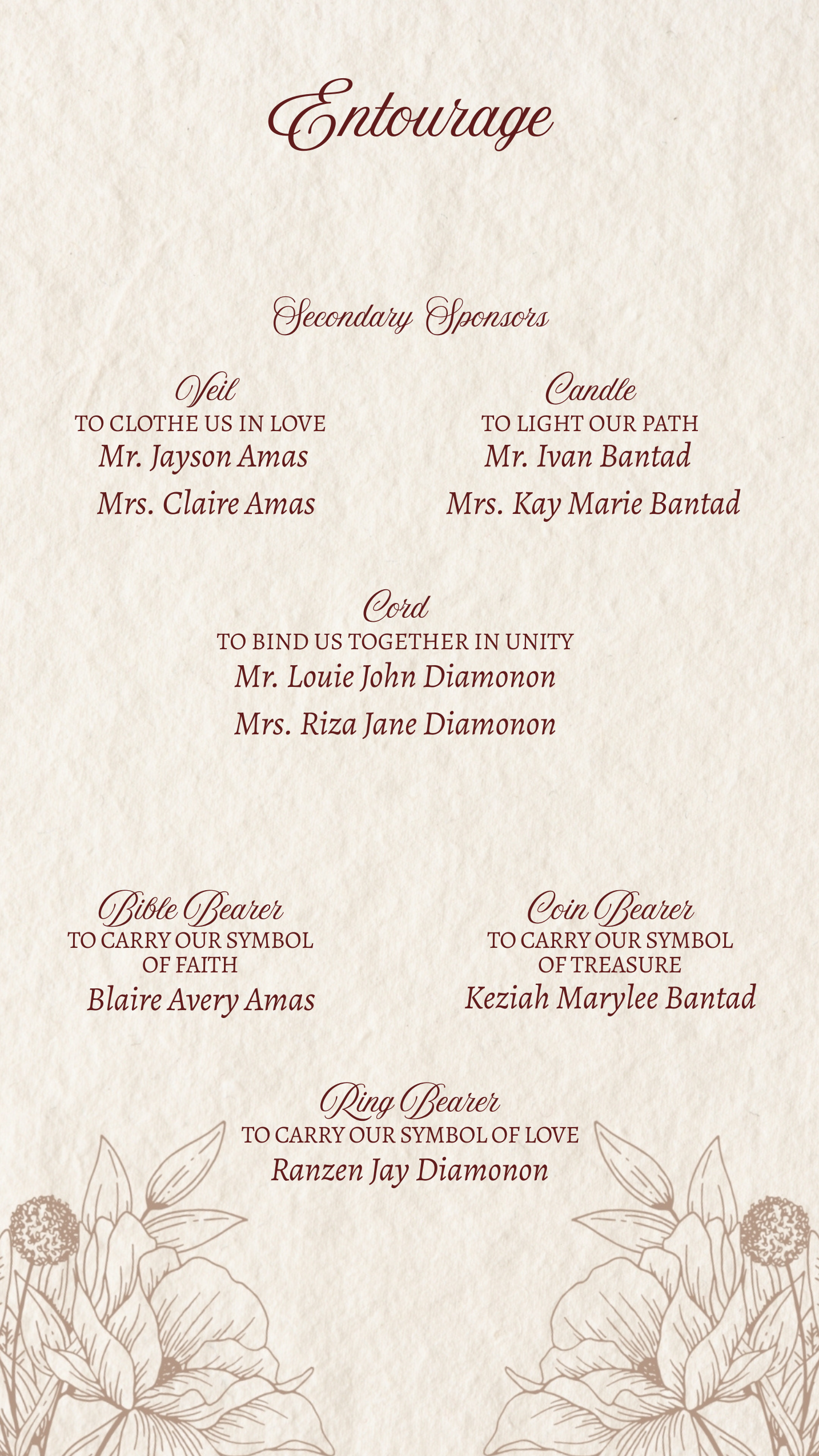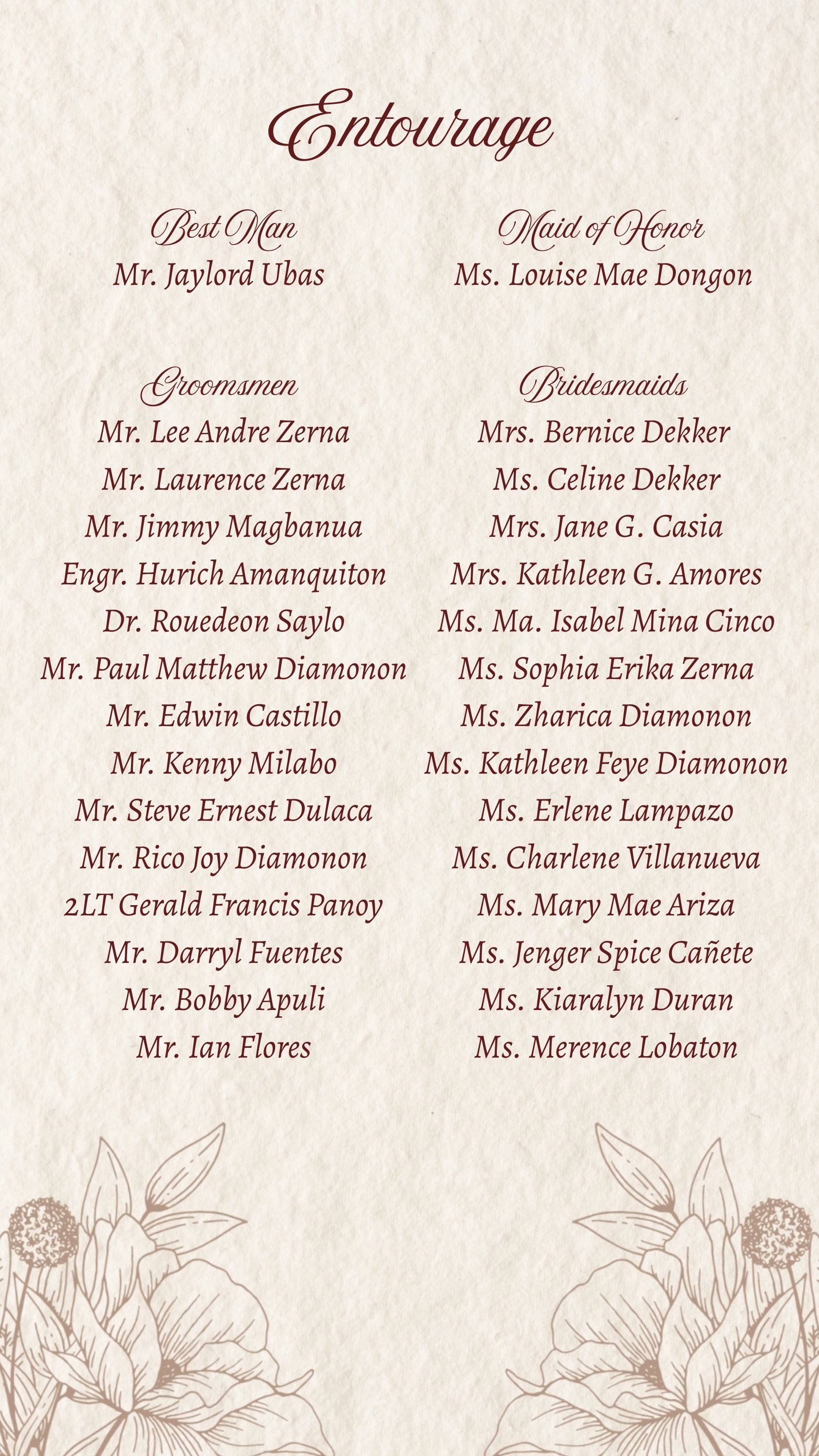 In celebration of our special day, we kindly ask the ladies to please follow the color dress code with a long dress. Please don’t use black, white or bright colors. For the gentlemen please ONLY wear barong, we also kindly ask if you could wear khaki trousers/slacks, we hope you could avoid black. We also request NO jeans, NO slippers and NO polo/shirts to maintain the graceful ambiance we're creating. Thank you!