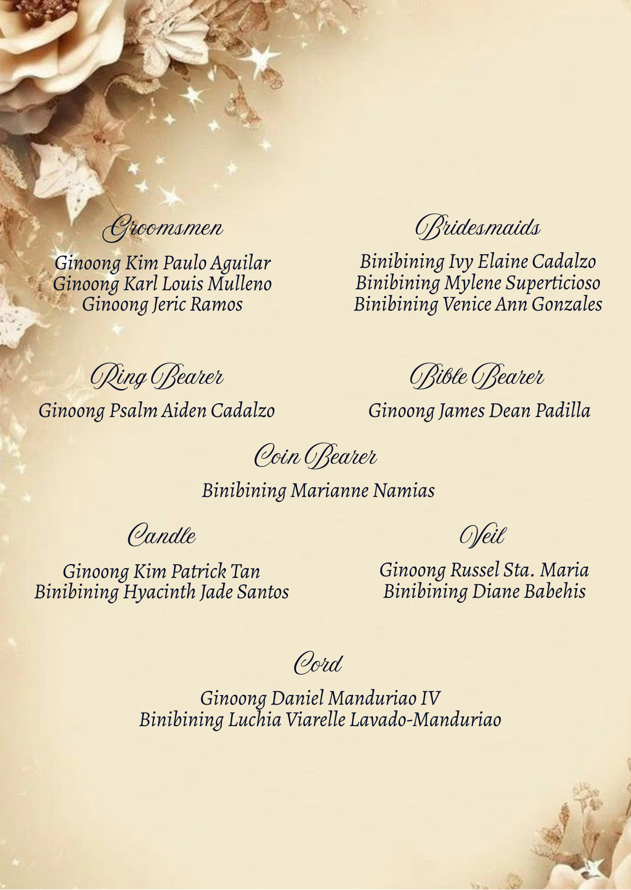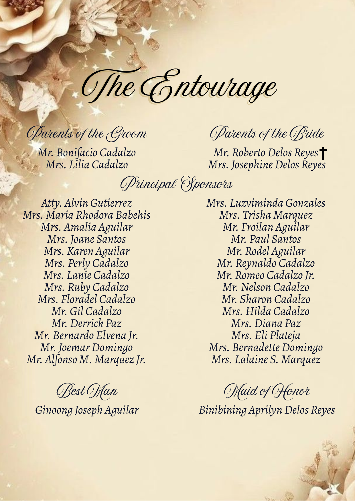 Please adhere to the specified dress code and color motif provided. Dressing accordingly is deeply appreciated, as it will contribute to the elegance and harmony of our celebration.