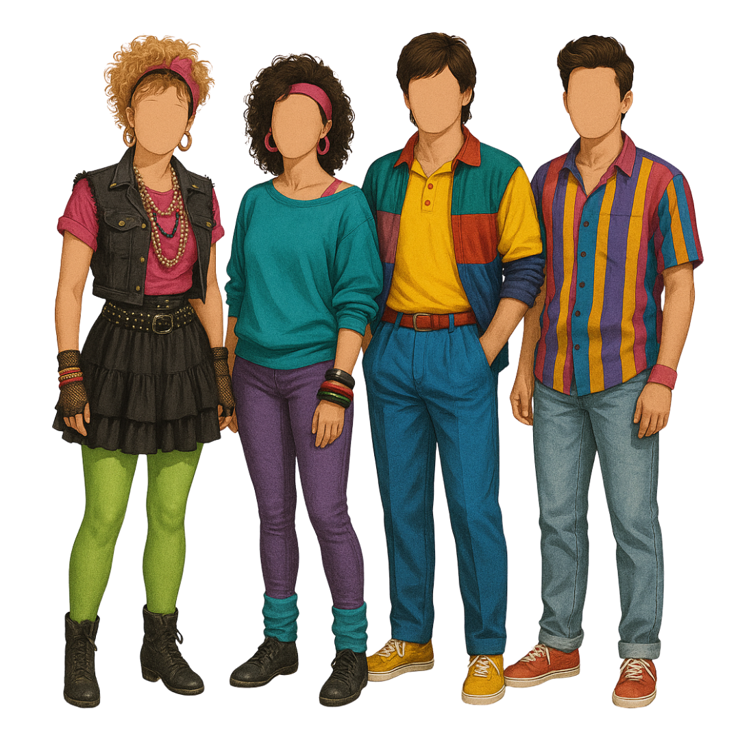 Bold collared shirts, rolled sleeves, high-waisted jeans, and color-block jackets. Finish with bright sneakers and that signature 80s confidence.