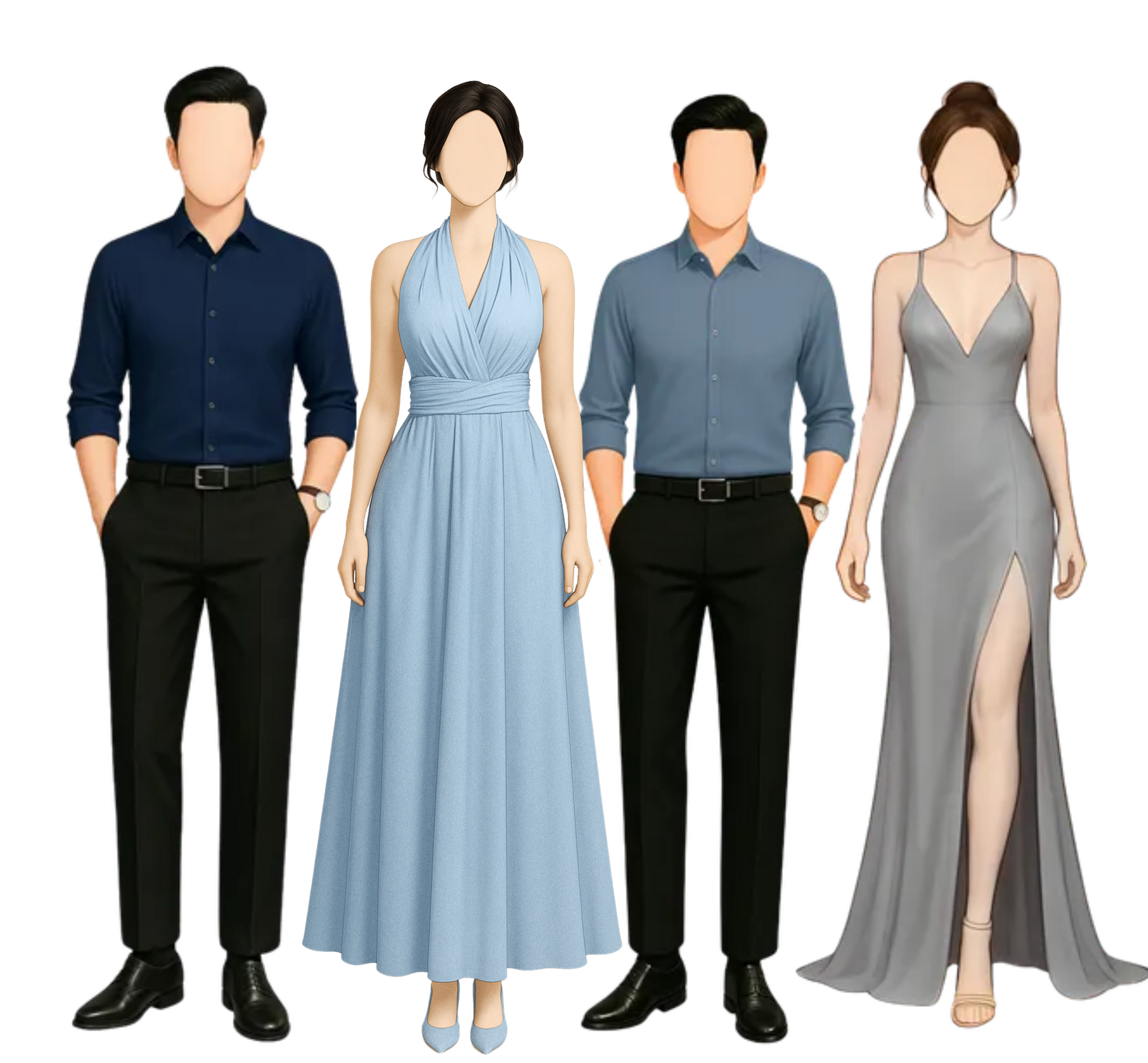 Please adhere to the specified dress code and color motif provided. Dressing accordingly is deeply appreciated, as it will contribute to the elegance and harmony of our celebration.