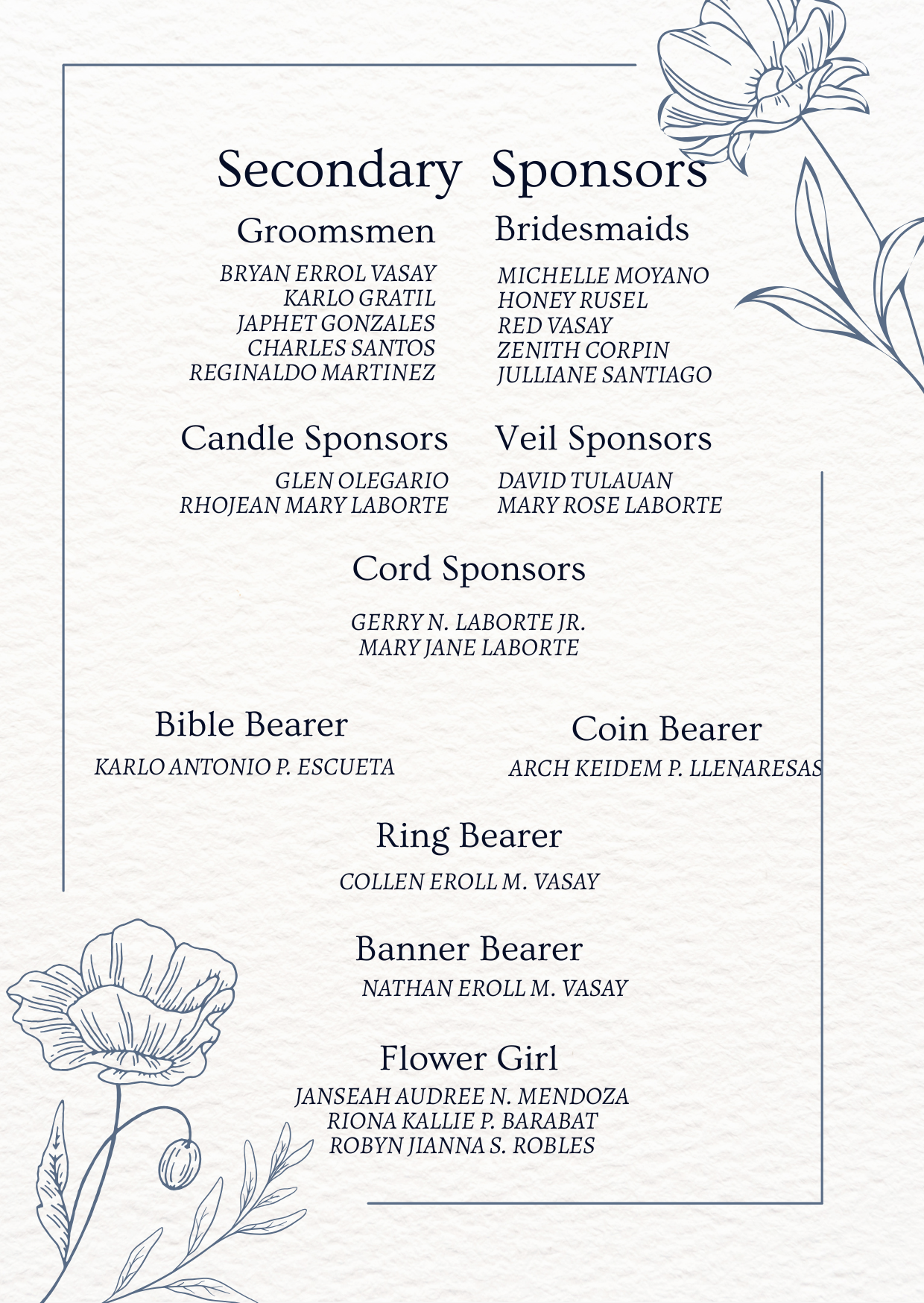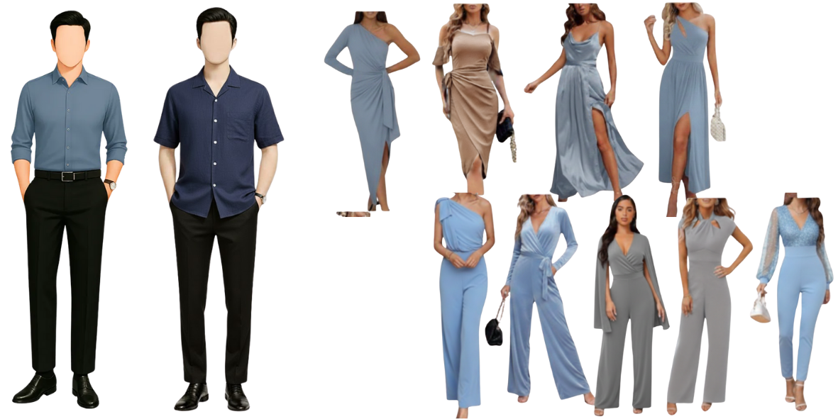 Please adhere to the specified dress code and color motif provided. Dressing accordingly is deeply appreciated, as it will contribute to the elegance and harmony of our celebration.