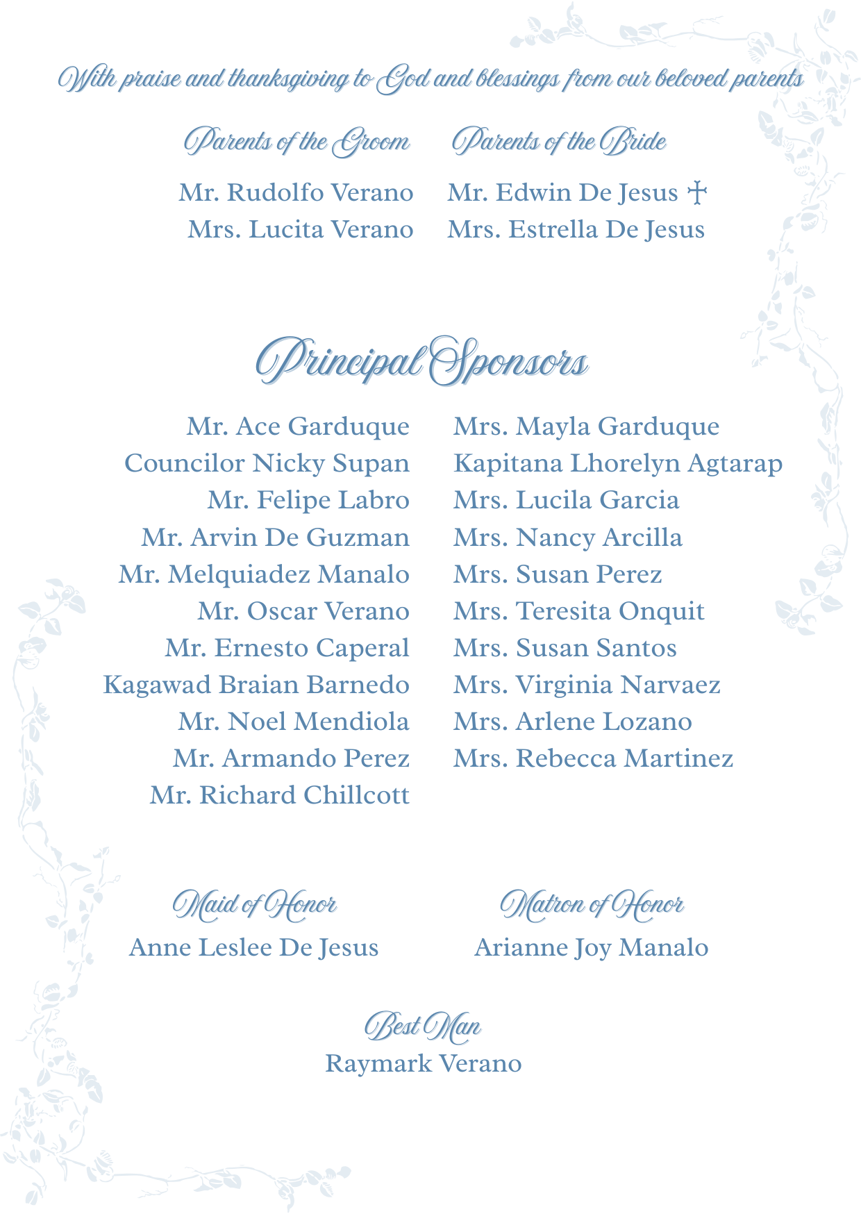 Please adhere to the specified dress code and color motif provided. Dressing accordingly is deeply appreciated, as it will contribute to the elegance and harmony of our celebration.