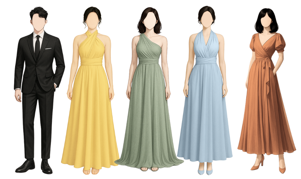 For the ladies: Full length or mid-length dresses. Satin, pattern & textures encouraged.